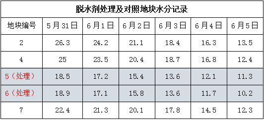 注:從水分變化看,脫水劑處理地塊確實(shí)在小麥成熟進(jìn)程中起到提前的作用,時(shí)間在3-5天。